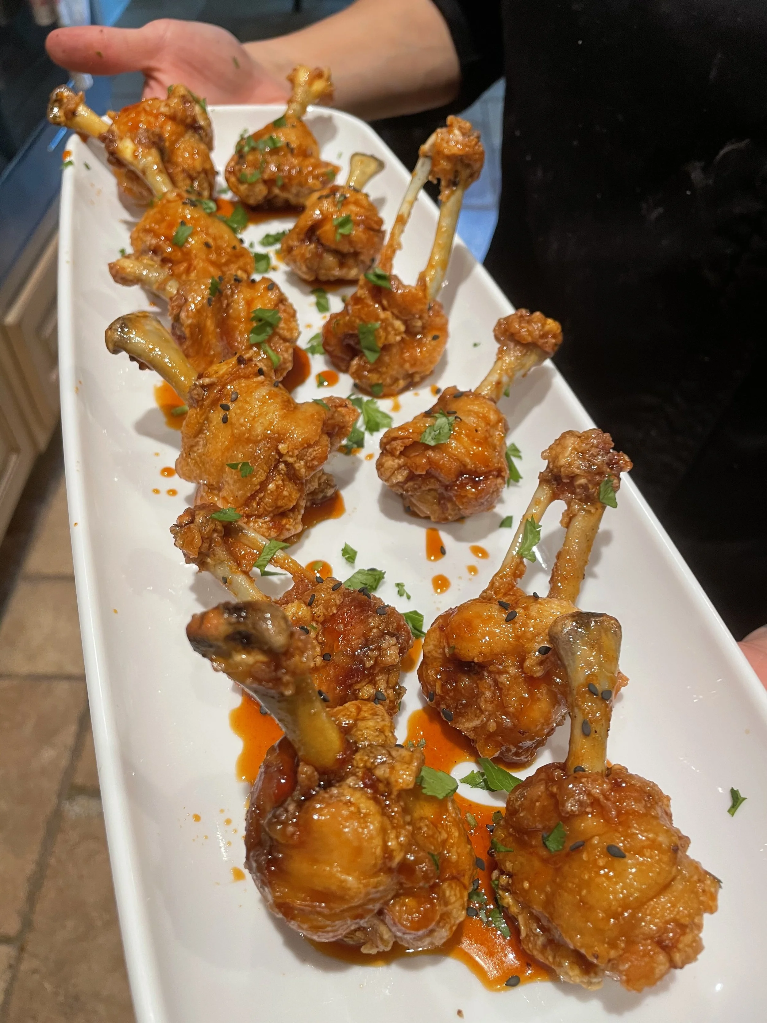 KOREAN FRIED CHICKEN SERVED WITH KIMCHI OVER CAROLINA GOLD RICE AND PICKLED CUCUMBER.